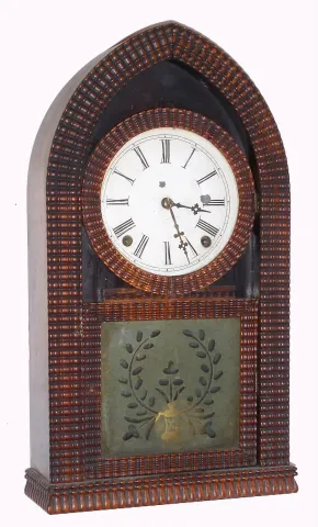 E. N. Welch, Forestville, Conn, Full Ripple Beehive shelf clock, with original frosted glass tablet showing a wreath, C.1855.