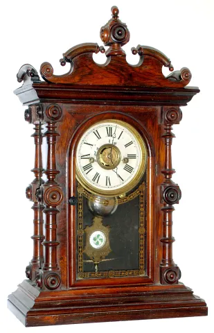 Welch Spring and Co., Forestville, Conn., "Cary VP" 8 day time, strike on bell and alarm spring driven movement in rosewood case, c1880