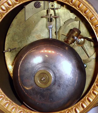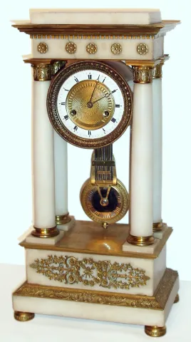French, 8 day time and strike four pillar marble and brass gilt empire clock, c1890