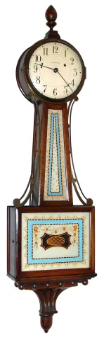 Waltham Clock Co., Waltham, Mass., "Presentation Banjo" wall clock 8 day time only weight driven movement in mahogany case with painted metal dial, c1930