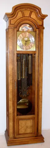 Howard Miller, Zeeland, Michigan, modern tall clock 8 day time, strike and chime on 9 tubes with option for Westminster, Whittington or St. Michael's tune weight driven movement in hard wood case with silvered metal dial with moon phase and applied brass