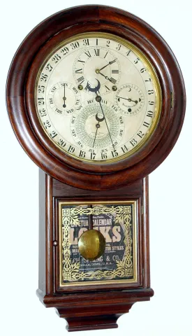 D. J. Gale, "Drop Calendar No. 3", perpetual calendar wall clock with 8 day spring driven movement with full astronomical indications for the age of the moon, day of week, date, month and equation of time chart showing sunrise and sunset times for New Eng