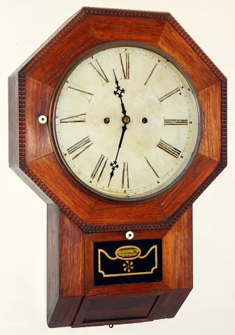 stripped rosewood veneered case in nice condition with some small chips on the back edge of the beveled bottom. Original painted dial has turned a lit...