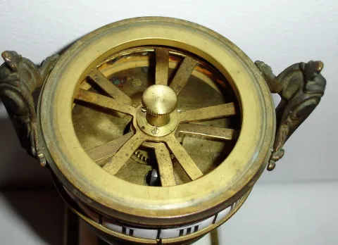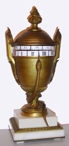 French, ormolu and white marble urn form with a snake pointer annular dial with a platform lever escapement driving two porcelain cartouche time rings, top is minutes and bottom hours, c1875