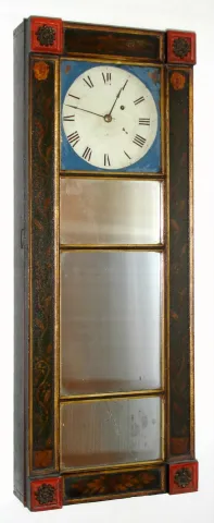 New Hampshire Mirror Clock timepiece, with a period stenciled mirror frame, c1840, with a purpose made rear box c1920 (has some age) and driven by a period banjo movement, c1840