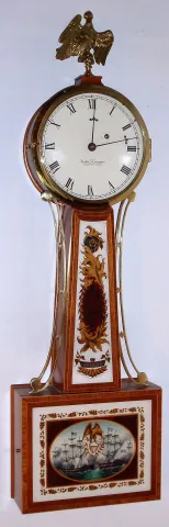mahogany and mahogany veneer banded case in very fine condition. Original tablets by Moberg, dial, hands, eagle finial and stamped weight. Ht 29"...