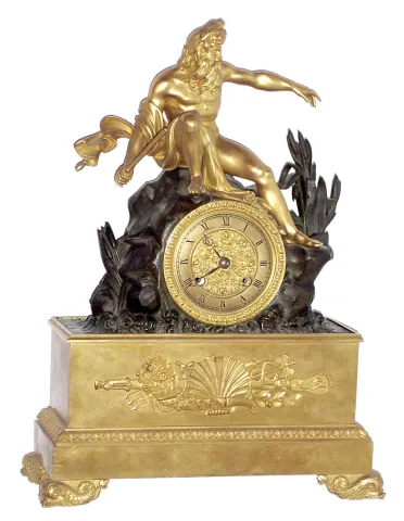 this elegant small clock is in beautiful condition, from dolphin feet to ornate dial center to dark-tone 'rocks' to seated Zeus (?) on top. Unsigned b...