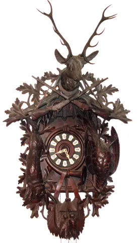 German Black Forest oversize cuckoo clock with 30 hour time, strike and musical three weight driven movement likely in linden wood case, c1880