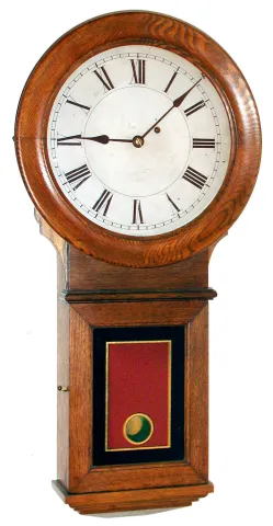 E. Howard and Co., Boston, Mass., "Regulator No. 70" wall clock 8 day time only weight driven movement in oak case with reverse painted lower tablet and painted metal dial, c1900