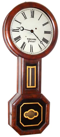 Baltimore Banjo style wall clock attributed to Williams and Hatch, North Attleboro, MA for Riggs and Bro., Philad.a 8 day time only weight driven wall clock in rosewood grain painted case with painted metal dial, c1860