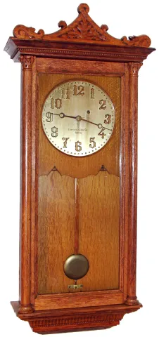 Eastman Clock Co., Boston "Regulator" wall clock 8 day time only weight driven movement in oak case with carved top and Corinthian style columns, matching beading above door and around base and solid brass dial with raised brass numerals, c1890