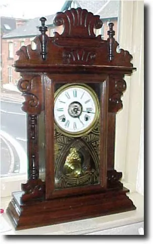 American design but made in Portugal. Looks like a late Ansonia design with rack strike and a seperate alarm mechanism. It looks great with a gilt pen...
