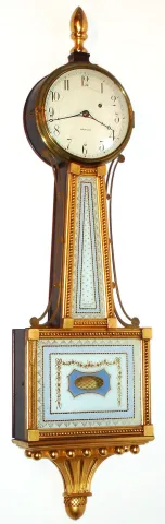 Waltham Clock Co., Waltham, Mass., banjo timepiece 8 day time only weight driven movement in gilded mahogany case with reverse painted tablets, c1930
