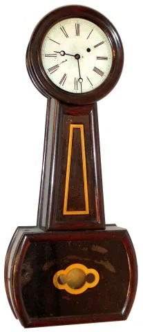 Davis, Polsey and Co., Boston, MA, "No. 4 Banjo" wall clock 8 day time only weight driven movement stamped "D P and CO" in cherry case with rosewood graining and painted metal dial, c1858