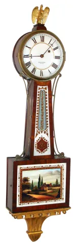 Walter H. Durfee, Providence, Rhode Island, banjo timepiece with 8 day time only weight driven movement in mahogany case with gold leafed presentation bottom and reverse painted throat and lower tablets and painted metal dial, c1910