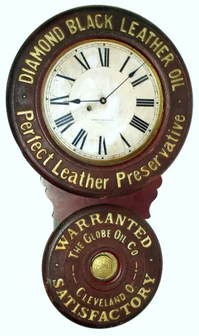 Baird Clock Co., Plattsburgh, New York, advertising wall clock for "DIAMOND BLACK LEATHER OIL Perfect Leather Preservative WARRANTED SATISFACTORY The Globe Oil Co. Cleveland O." The movement is 8 day time only spring driven in a typical Baird paper mache