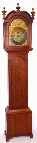 the case (c.1800) with quarter sawn oak door is earlier than the Victorian chime movement and is refinished with the bottom ogee bracket feet old repl...
