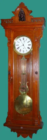 New Haven Clock Co., New Haven, Conn., "Regulator No. 2" wall clock 8 day time only weight driven movement with pinwheel escapement in oak case with porcelain dial and sweep seconds, c1881