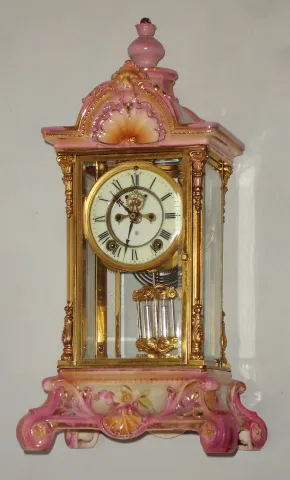 this clock is almost perfect with no chips, cracks or hurts of any kind. The simulated mercury pendulum and visible escapement with jewel pallets are ...