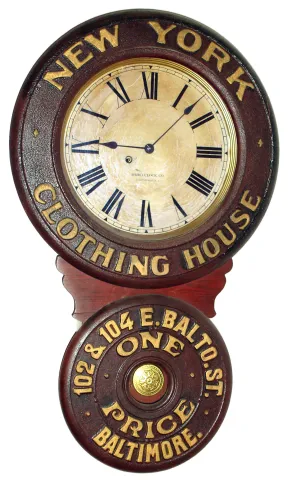 Baird Clock Co., Plattsburgh, New York, advertising wall clock for "NEW YORK CLOTHING HOUSE 102 and 104 E. BALTO. ST. BALTIMORE". The movement is 8 day time only spring driven in a typical Baird paper mache doors and wood body case with papered metal dial