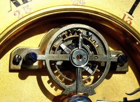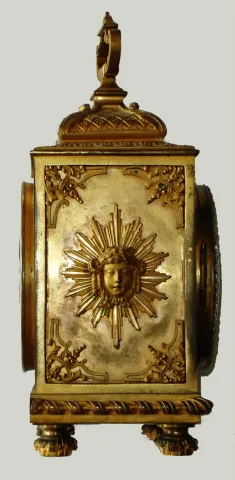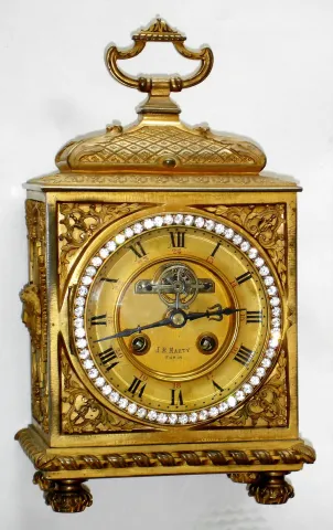 French, Desk clock in bronze/ ormolu, in the style of a Pendule d'officer, and with open escapement on the dial, 8-day, gong striking, and with the retailer's name, "J. B. MARTY, Turin" showing clearly in the dial center.