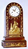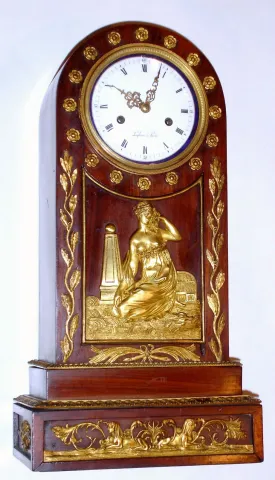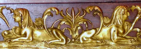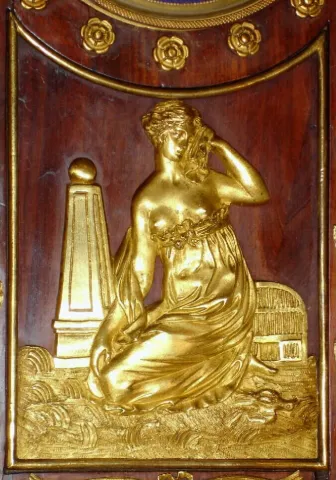 French, Empire style mahogany mantle clock, featuring a central frieze with a bare breasted maiden next to an obelisk surmounted by a globe. The base of the case with Egyptian themes, two sphinx with the head of Cleopatra. Bell strike movement has silk th
