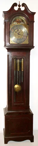 American, for Tiffany and Co., New York 8 day, quarter chiming, 3-weight, playing Westminster tune on 5 tubes in a mahogany case with reeded corner columns on both the broken arch hood with center final and the trunk. Has Durfee chime tubes. The silvered