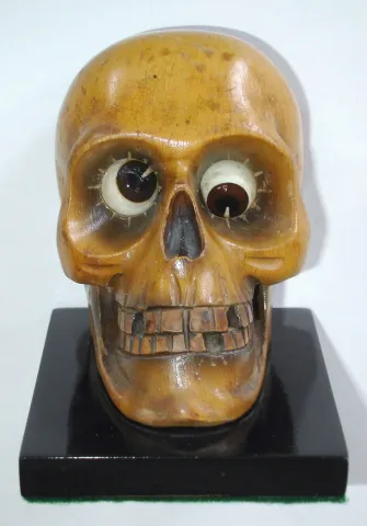 German, Oswald Uhrenfabrik, "Skull" of carved wood, telling time with rotating eyes; time in photo is 1:30; minutes showing to the right, c1935