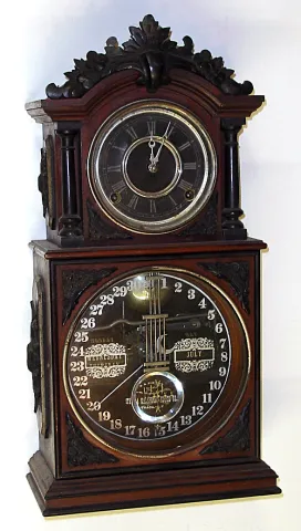 Ithaca "No. 3 1/2 Parlor" black dial 8 day walnut striking calendar shelf clock, c1881.
