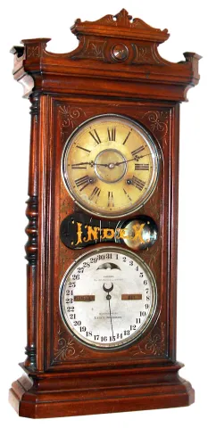 Ithaca Calendar Clock Co, Ithaca, NY, "Index" large model calendar clock manufactured for Lynch Brothers 8 day time and strike spring driven movement with perpetual calendar in mahogany case. Both dials are papered metal, c1870