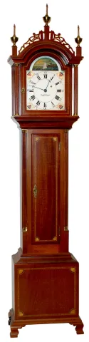 Foster Campos, Pembroke, Mass., "Grandmother Clock" 8 day time only weight driven movement in Roxbury style inlaid mahogany case with painted metal dial and rocking ship, c1982