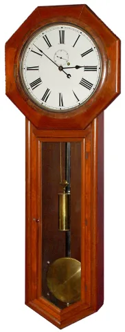 Seth Thomas Clock Co., Thomaston, Conn., "Regulator No. 18" wall clock 8 day time only weight driven movement in mahogany case with painted metal dial, brass knurled top and bottom weight, and 8" brass bob, c1891{dated on rear of case}