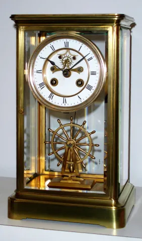 French, 4-glass crystal regulator with uncommon detached balance wheel in the form of a ship's wheel, the wheel rolling a carriage mounted to the base of the case, and a long crutch extending to an impulse pin on the rear of the wheel . The escapement, wi