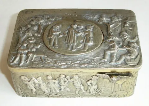 Swiss, Singing Bird Box, an embossed silver case featuring village scenes of people in period costumes, some dancing, some in a musical group, others sitting, holding hands, even the very bottom panel includes a couple dancing on the beach, with a pipe sm