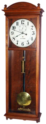 Seth Thomas Clock Co., Thomaston, Conn. "Regulator No. 20" wall clock 8 day time only weight driven movement in mahogany case with painted metal dial, c1909