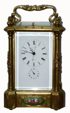 French, Brass cased carriage clock, with columns, engraving and case appliques, for the eastern market. Note the bell is for the alarm only, Hour strike is on a gong in the base and a fine chain extends from the articulated gong hammer up to the striking