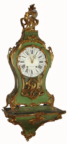 Belgian, E. Giddius Rousseau, Bruxelles, a green Neuchatel clock and bracket, quarter striking, with 13 piece dial, c1790