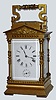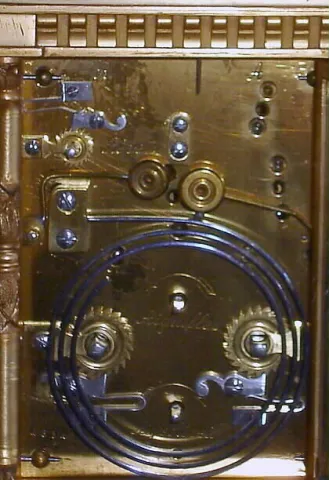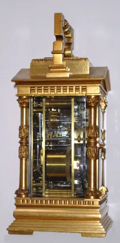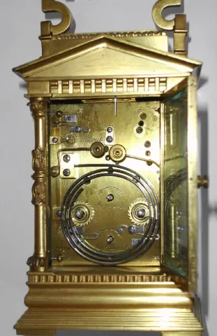 French, Brass Cased Carriage Clock, in an architectural case with Corinthian columns and a pediment top with original silvered platform visible through rectangular lens at top. This is a time, strike, repeat and alarm carriage clock, c1900