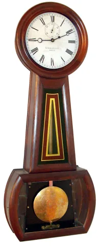 E. Howard and Co., Boston, Mass. "No. 1 Banjo" with 8 day time only weight driven movement in rosewood grain painted case with painted iron dial and reverse painted throat tablet, c1880