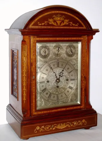 English, large inlaid mahogany quarter chiming bracket clock, 3-fusee, chiming on your choice of 8 bells or 4 gongs [and striking the hours on a deep toned cathedral gong, with a rectangular dial, engraved and silvered, and with subsidiary dials in the ar