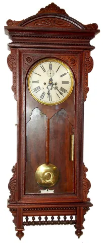 Waterbury Clock Co., Waterbury, Conn., "Regulator No. 57" wall clock 8 day, time only, 2-weight driven movement in walnut case with painted metal dial with second's bit, c1905