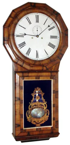 Seth Thomas Clock Co., Plymouth Hollow, Conn., "Regulator No. 1 Extra" wall clock 8 day time and strike weight driven movement in rosewood veneered mahogany case with reverse painted tablet and painted metal dial, c1875