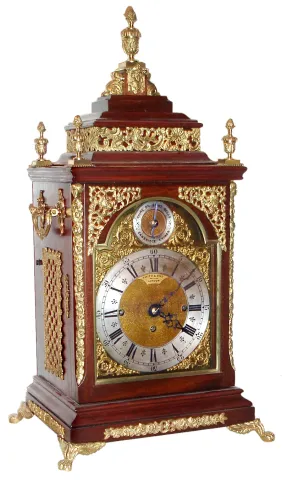 English, Smith and Sons, London, 3-fusee, quarter chiming bracket clock, mahogany case with arched dial, cast spandrels and applied silvered chapter ring. Chimes the quarters on a nest of 8 bells (choice of tune), and strikes the hour on a large cathedral