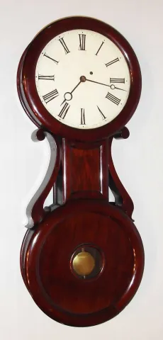 Baltimore Banjo attributed to George D. Hatch wall clock 8 day time only weight driven movement in highly stylized mahogany case with bold mahogany side arms pendulum aperture and painted metal dial, c1860