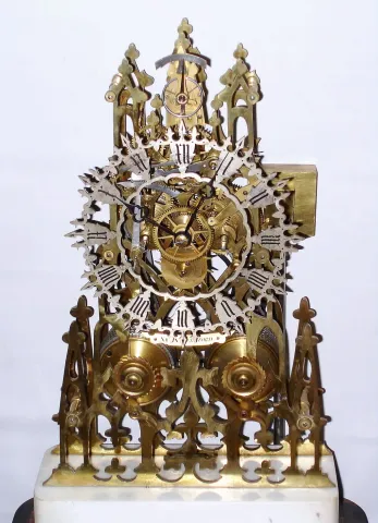 English Skeleton Clock 2-fusee, striking on a gong, attributed to Wm F. Evans of Handsworth (near Birmingham), movement with a vertical platform/lever at the top of the front plate, the clock on a rectangular marble block, mounted to a movement veneered b
