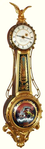 Elmer O. Stennes, Weymouth, Mass., "Girandole" wall clock 8 day time only weight driven movement in gold leafed mahogany case with reverse painted convex throat and lower glass tablets and painted metal dial, dated 1972