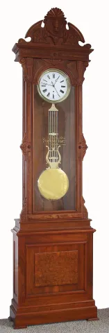 New Haven Clock Co., New Haven, Conn,, standing jeweler's "Regulator No. 4" 8 day time only weight driven movement with lyre / grid iron pendulum in walnut case with burled walnut highlights and white porcelain dial with sweep seconds, c1885