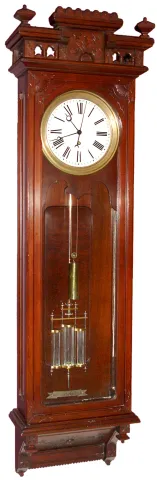 Wm. L. Gilbert Clock Co., Winsted, Conn., "Regulator No. 18" wall clock 8 day time only weight driven movement in mahogany case with porcelain enamel dial and sweep seconds hand, and 3-jar mercury pendulum (less mercury) c1901