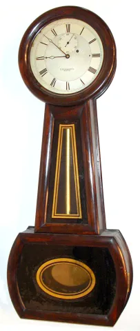 A. Howard, Boston, Mass., "No. 1 Banjo", made for and sold by Riggs and Bro. Jewelers, Philadelphia, Pa. The 8 day time only weight driven movement is signed A. Howard, Boston. The painted paper over iron dial has E. Howard and Co., Boston signature, c190