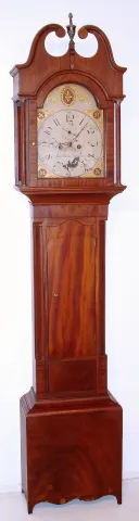 Aaron Brokaw, Bridgetown, New Jersey tall clock 8 day time and strike weight driven movement with unusual count wheel strike in mahogany and mahogany veneer case with rounded corner columns and typical New Jersey mid-panel and painted metal dial with date